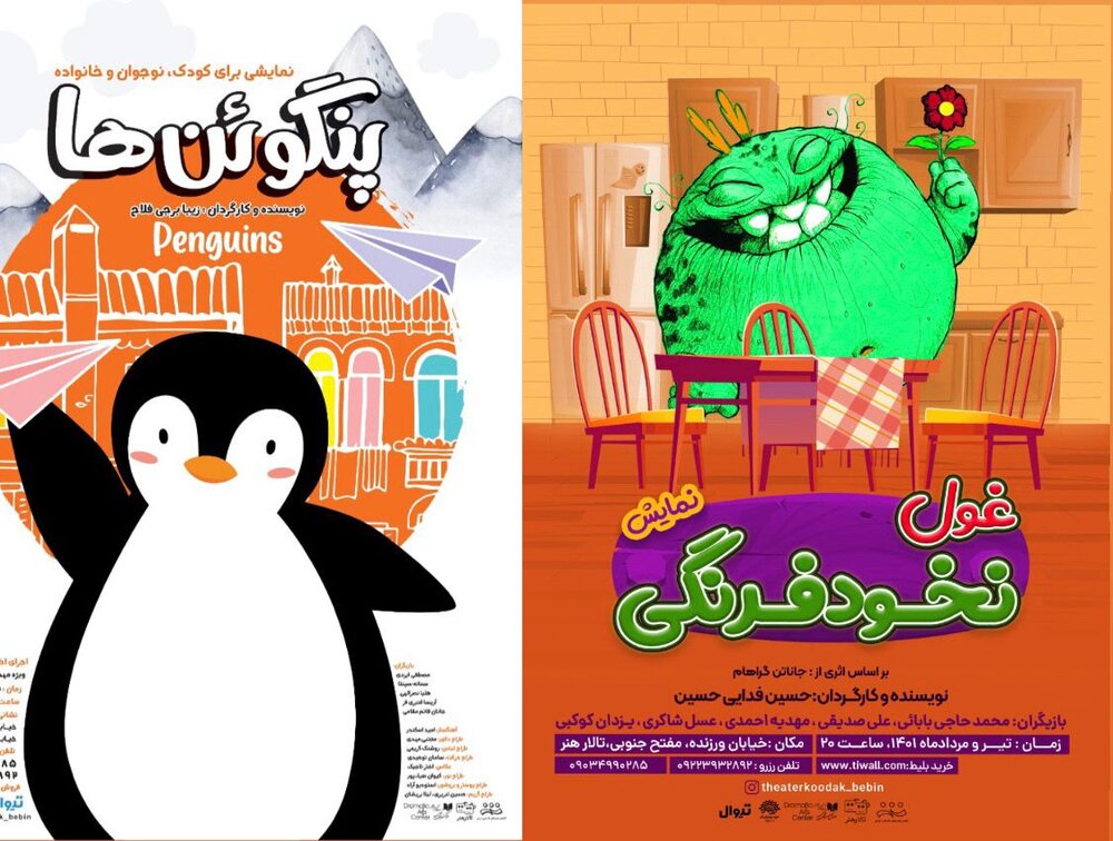 نمایش «پنگوئنها» به کارگردانی زیبا برجی فلاح ساعت ۱۸:۴۵ و نمایش سینا و غول نخود فرنگی به کارگردانی حسین فدایی حسین ساعت ۱۹:۴۵ روی صحنه خواهد رفت.
