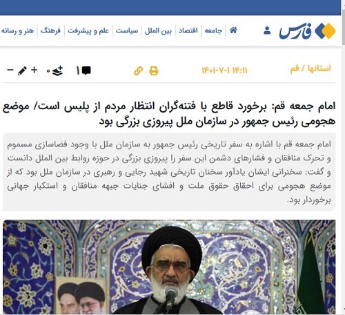 وی در ادامه با اشاره به سفر تاریخی رئیس جمهور به سازمان ملل علیرغم فضاسازی مسموم و تحرک منافقان و فشارهای دشمن این سفر را پیروزی بزرگی در حوزه روابط بین الملل دانست و افزود: این سفر و سخنرانی ایشان یادآور سخنان تاریخی شهید رجایی و رهبر معظم انقلاب در سازمان ملل بود که از موضع هجومی برای احقاق حقوق ملت ایران و افشای جنایات جبهه منافقان و استکبار جهانی برخوردار بود.