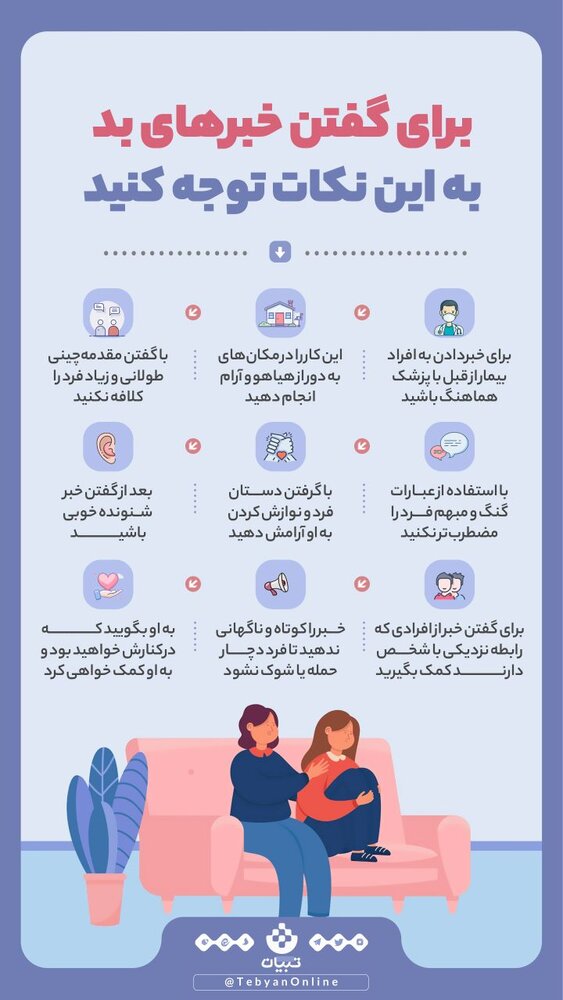 خبر را کوتاه و ناگهانی ندهید تا فرد دچار حمله یا شوک نشود و با استفاده از عبارات گنگ و مبهم فرد را مضطرب تر نکنید. منبع: تبیان