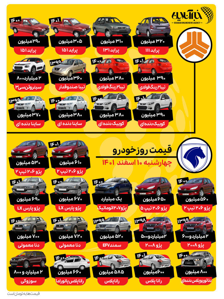 ، بررسی نوسانات قیمتی در بازار خودرو از جهش دوباره قیمتها در این بازار حکایت دارد به طوری که در بین خودروهای پژو مدل پژو ۲۰۶ تیپ ۲ مدل ۱۴۰۰ از ۵۵۰ میلیون تومان در روز گذشته امروز به ۵۶۰ میلیون تومان رسیدهاست و مدل ۱۴۰۱ آن نیز از ۶۰۰ میلیون تومان در روز گذشته امروز به ۶۱۰ میلیون تومان رسیدهاست و مدل ۱۳۹۹ آن نیز از ۵۱۵ میلیون تومان در روز گذشته امروز به ۵۳۰ میلیون تومان رسیدهاست و پژو ۲۰۷ اتوماتیک مدل ۱۴۰۰ نیز از ۹۳۰ میلیون تومان در روز گذشته امروز به یک میلیارد تومان رسیدهاست.