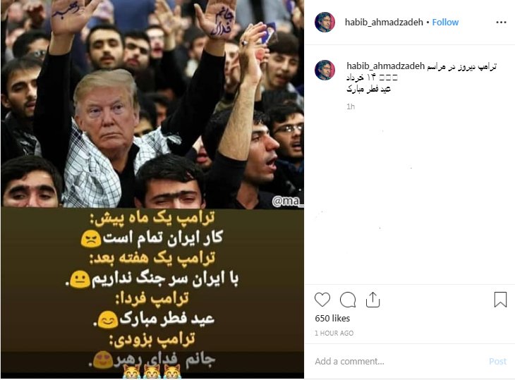 به گزارش خبرگزاری خبرآنلاین، حبیب احمدزاده، داستان‌نویس، فیلمساز و پژوهشگر، با بازنشر یک شوخی تصویری، صفحه اینستاگرامش را به‌روز کرده و عید فطر را تبریک گفته است. تغییر مواضع ترامپ علیه ایران در چند روز گذشته، دستمایه ساخت این شوخی تصویری بوده است.