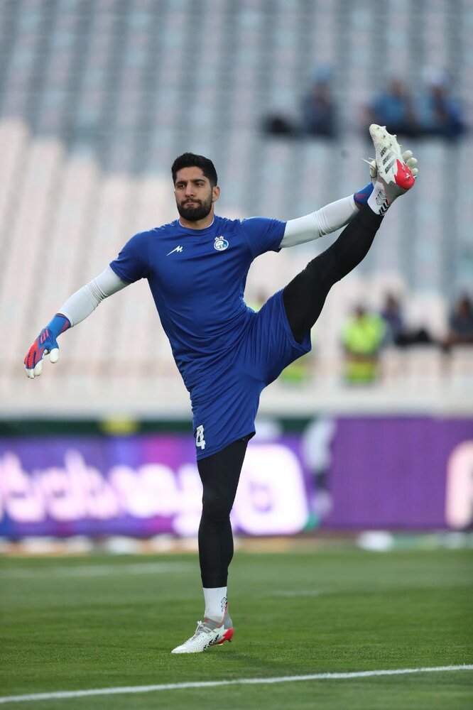 * سیدحسین حسینی دروازهبان اول آبیها که در این بازی محروم است، هنگام گرم کردن تیم با لباس شخصی کنار زمین حاضر شد و مورد تشویق هواداران قرار گرفت.