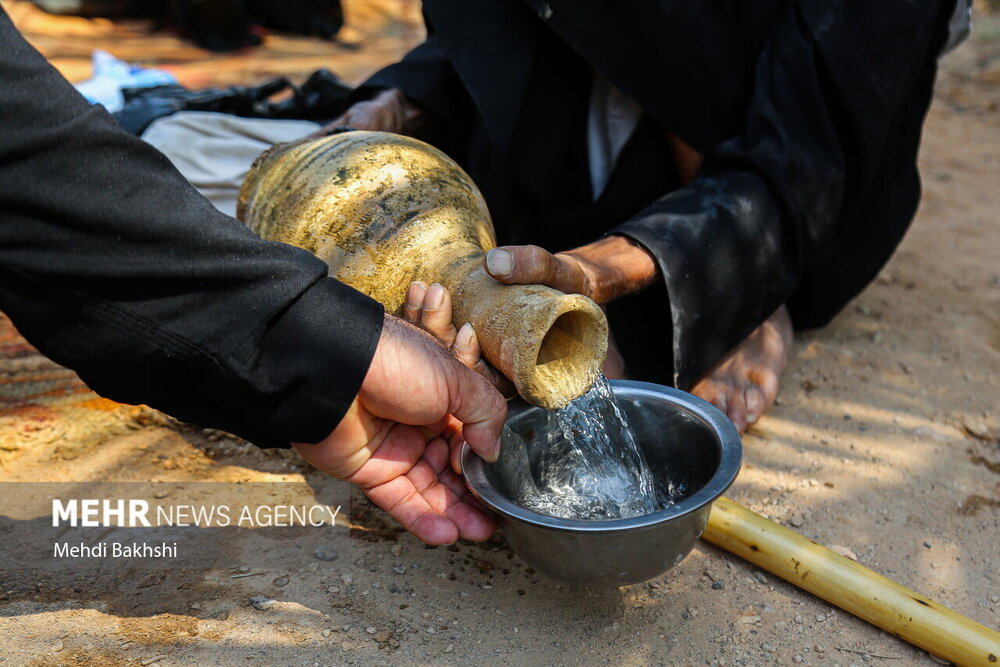 حاج کاظم پیرمردی ۸۶ است که از سالهای بسیار دور کارش سقایی در مسیر شط الفرات است؛ این قدیمی ترین راه اهالی نجف و سایر شهرهای جنوبی عراق به سمت کربلا است. منبع: مهر
