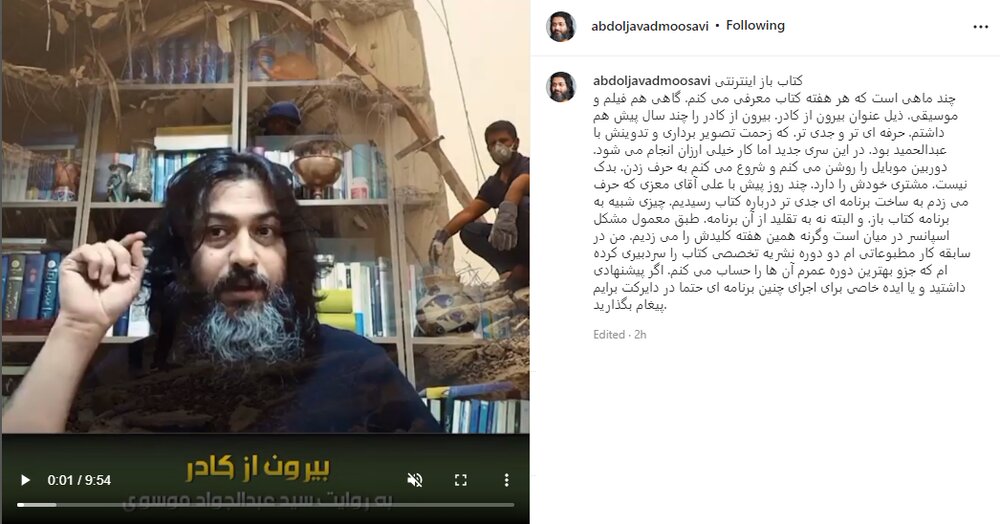 ، سیدعبدالجواد موسوی، شاعر، روزنامهنگار و منتقد هنری با اعلام خبر تولید برنامهای در حوزه کتاب، در صفحه اینستاگرامش چنین نوشت: