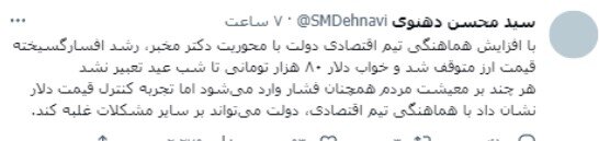 با افزایش هماهنگی تیم اقتصادی دولت با محوریت دکتر مخبر، رشد افسارگسیخته قیمت ارز متوقف شد و خواب دلار ۸۰ هزار تومانی تا شب عید تعبیر نشد. هر چند بر معیشت مردم همچنان فشار وارد میشود اما تجربه کنترل قیمت دلار نشان داد با هماهنگی تیم اقتصادی، دولت میتواند بر سایر مشکلات غلبه کند.