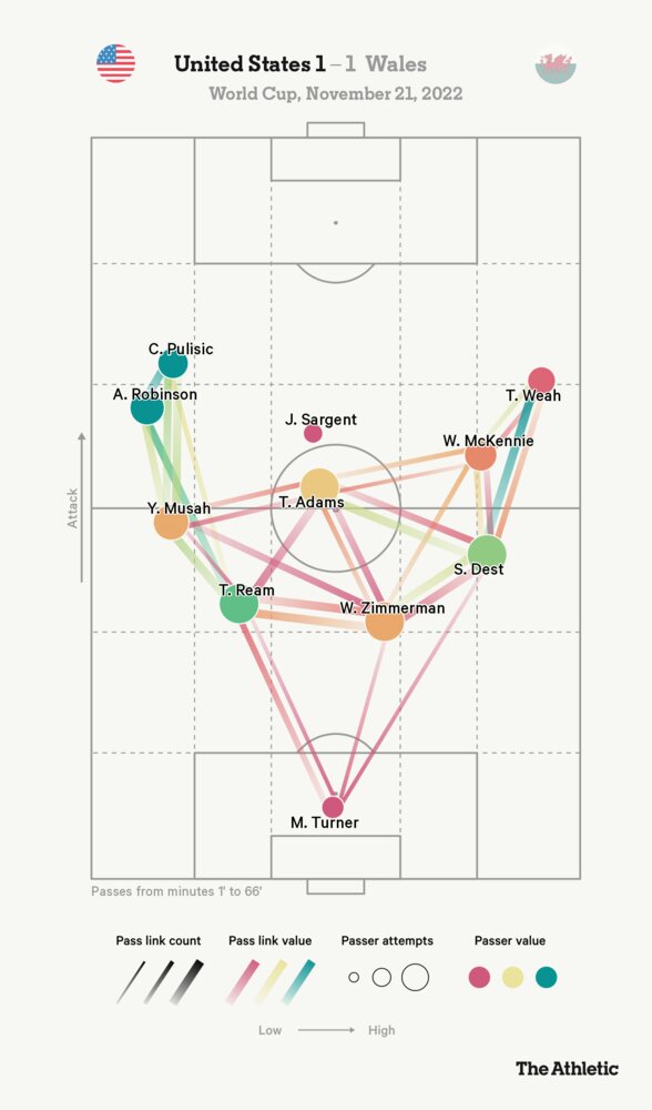 با این حال آنها به طور قابل توجهی کمتر از سایر جناحین برای استفاده از این تاکتیک مؤثر بودند. آمریکا ممکن است کیفیت بازیکن انفرادی کمتری نسبت به فرانسه یا آلمان داشته باشد اما به سادگی در برابر تیم پنجدفاعه ولز که پوشش بیشتری در مناطق گسترده داشتند مبارزه کردند و از نظر عددی با آنها مطابقت داشتند.
