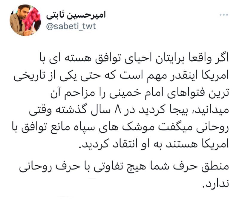 در ۸ سال گذشته وقتی روحانی میگفت موشک های سپاه مانع توافق با امریکا هستند به او انتقاد کردید.