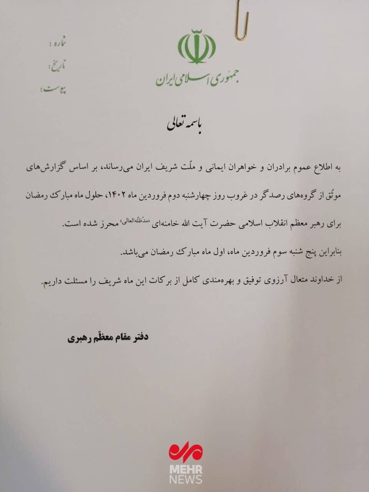 به اطلاع عموم برادران و خواهران ایمانی و ملت شریف ایران میرساند، براساس گزارشهای موثق از گروههای رصدگر در غروب روز چهارشنبه دوم فروردین ماه ۱۴۰۲، حلول ماه مبارک رمضان برای رهبر معظم انقلاب اسلامی حضرت آیتالله خامنهای مدظلهالعالی محرز شده است.