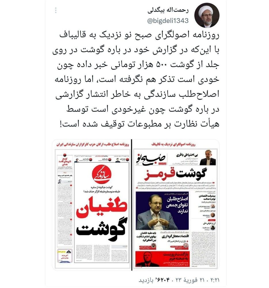 روزنامه اصولگرای صبح نو نزدیک به قالیباف با اینکه در گزارش خود در باره گوشت در روی جلد از گوشت ۵۰۰ هزار تومانی خبر داده چون خودی است تذکر هم نگرفته است، اما روزنامه اصلاحطلب سازندگی به خاطر انتشار گزارشی در باره گوشت چون غیرخودی است توسط هیأت نظارت بر مطبوعات توقیف شده است!