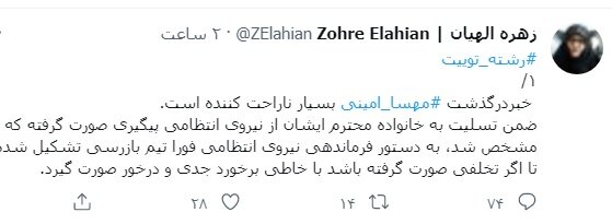 درگذشت #مهسا_امینی بسیار ناراحت کننده است. ضمن تسلیت به خانواده محترم ایشان از نیروی انتظامی پیگیری صورت گرفته که مشخص شد، به دستور فرماندهی نیروی انتظامی فورا تیم بازرسی تشکیل شده تا اگر تخلفی صورت گرفته باشد با خاطی برخورد جدی و در خور صورت گیرد.