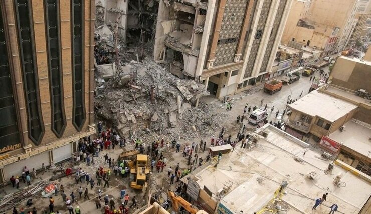 با فروریختن بخشهای دیگری از سازه به جا مانده از برج متروپل آبادان، ماموران امدادی و خدمات رسانی در محل حاضر شدند.