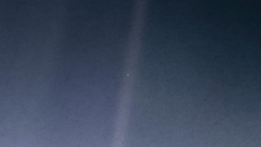سیگان در اینباره نوشت:« دوباره به این نقطه نگاه کنید. اینجاست. اینجا خانه ماست. این ما هستیم. هر کسی را که دوست دارید،هر کسی را که میشناسید، هر کسی که تا بحال نامش را شنیدهاید، و هر انسانی که تاکنون وجود داشته، زندگی خود را بر روی این نقطه آبی سپری کرده است». تصویر زمین از منظر کیهانی- و به گفته او«نقطهای غبارآلود معلق در پرتو نور ماه»- به اندازه عکس طلوع زمین که توسط یکی از فضانوردان آپولو ۸ از روی کره ماه گرفته شده بود، بیادماندنی شد.