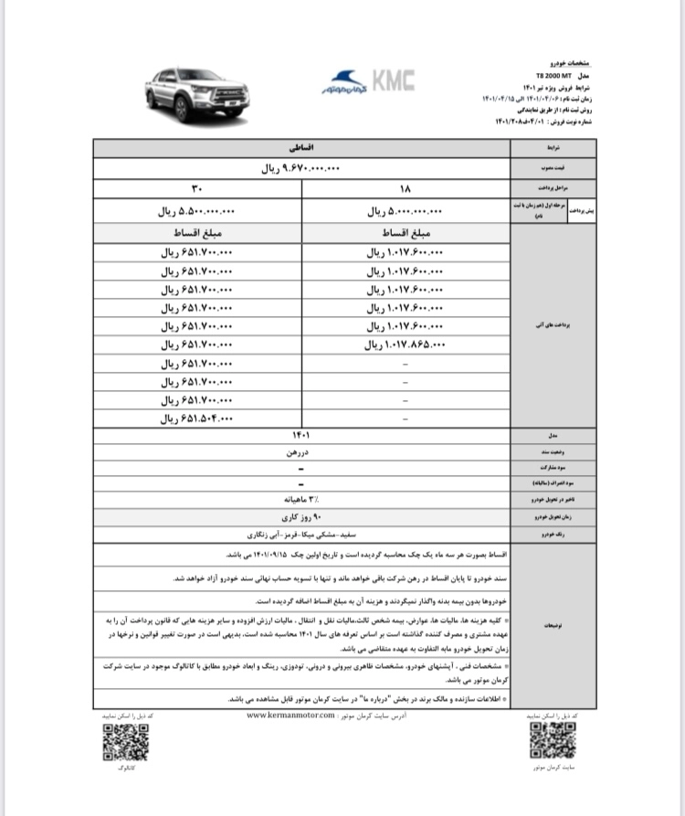 اقساط در مدل ۱۸ ماهه از طریق ۶ فقره چک ۱۰۱ میلیون و ۷۰۰ هزار تومانی و در اقساط ۳۰ ماهه نیز ۱۰ فقره چک ۶۵ میلیون و ۱۷۰ هزار تومانی قابل پرداخت بوده و پیش پرداخت ۵۰۰ و ۵۵۰ میلیون تومانی برای این پیکاپ تعیین شده است.
