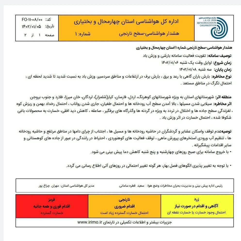 گفتنی است، با خروج سامانه بارشی کاهش محسوس دما در سطح چهارمحال و بختیاری و لغزندگی و یخبندان معابر پیش بینی میشود.