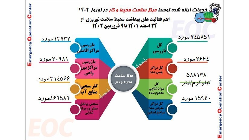 بنابر اعلام مرکز سلامت محیط و کار وزارت بهداشت، از ابتدای آغاز طرح سلامت نوروزی در ۲۴ اسفند ۱۴۰۱ تا ۹ فروردین ۱۴۰۲ تعداد بازرسی‌ها از مراکز مختلف در طرح سلامت نوروزی به ۷۴۵ هزار و ۸۵۱ مورد رسیده است.