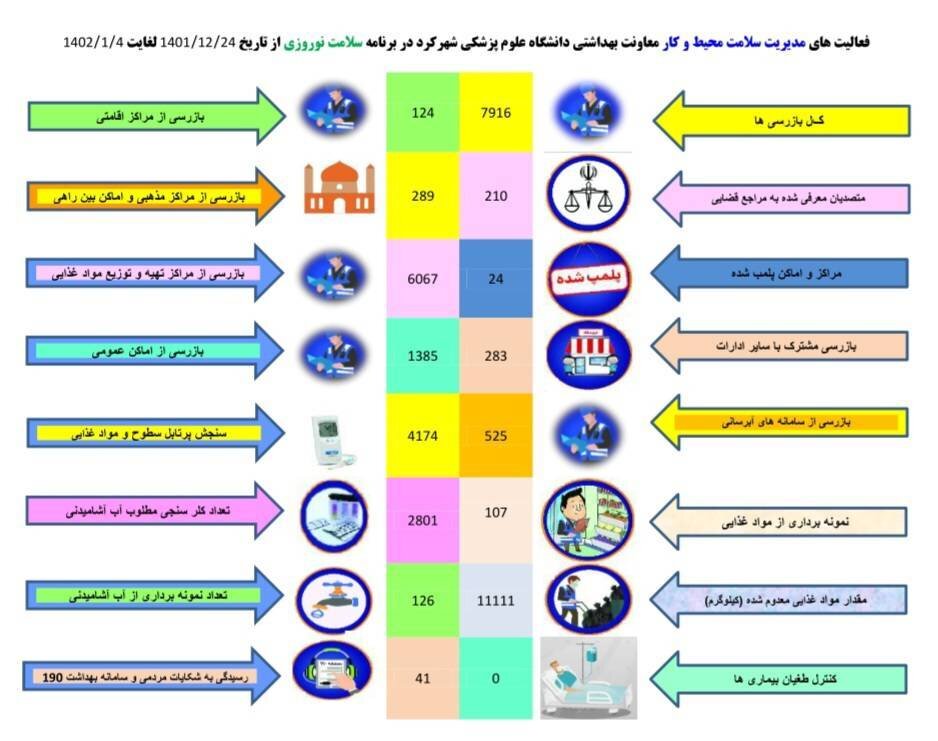 استان چهارمحال وبختیاری، دکتر بنایی در تشریح اهم فعالیت‌ها و خدمات ارائه شده توسط مدیریت سلامت محیط و کار در نوروز ۱۴۰۲ اظهار داشت: در این مدت ۷ هزار و ۹۱۶ مورد بازرسی انجام شد که باعث پلمپ ۲۴ مرکز متخلف بهداشتی و معدوم سازی ۱۱ هزارو ۱۱۱ کیلوگرم (بیش از ۱۱ تن) مواد غذایی غیربهداشتی شد.