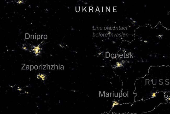 در این تصویر برخی مناطق درگیر جنگ اوکراین را از فضا می‌بینیم. در اواخر سال ۲۰۲۱ و پیش از شروع جنگ روشنایی بسیار بیشتر است اما با شروع جنگ و تبدیل شدن خاک اوکراین به هدف حملات نیروی‌های روس رفته رفته از روشنایی کاسته می‌شود.